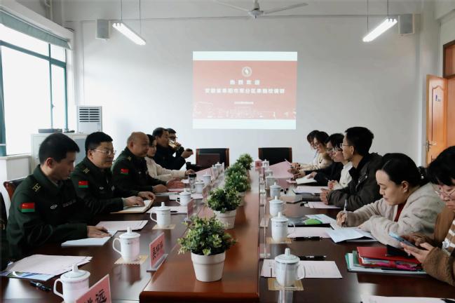 在座谈交流环节,毛燕静首先代表学校武装部向安徽省阜阳市军分区、市教委学生处和上海外国语大学的领导和同仁们对本次莅临指导表示热烈欢迎,就他们对我校征兵工作的关心、支持表示衷心感谢。随后,毛燕静向调研组详细介绍了我校征兵工作的机制、具体征兵开展情况以及学生军事理论相关社团的运作情况。会上,与会人员就征兵宣传工作、征兵政策落实、退役学生管理等具体工作展开了充分的交流探讨。军、校双方进行友好、深入、广泛地沟通,共同寻求征兵工作方法路径,力促取得卓越实效。