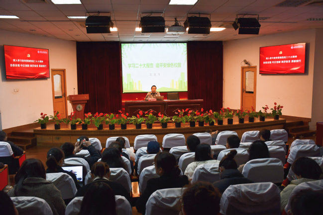 为学习宣传贯彻党的二十大精神,深刻理解和把握党的精神实质,3月17日上午,学校在报告厅举行党委理论学习中心组学习会,副校长王云飞作《学习二十大报告 建平安绿色校园》专题报告。学习会由党委副书记刘丽主持。