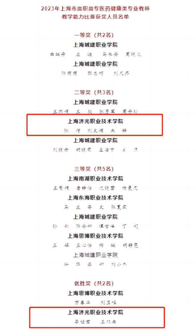 2023年上海市高职高专院校医药健康类专业教师教学能力比赛于3月26日举行,本次比赛共有15支教师团队报名参赛,12支队伍进入现场赛环节。经过层层选拔,最终我院张倩、刘文娟、朱静三人组成的团队荣获二等奖,李桂君、王双冉二人组成的团队荣获优胜奖。张倩团队被推荐参与2023年上海市高职高专院校教学能力大赛暨全国职业院校技能大赛教学能力比赛上海市选拔赛(高职高专)。