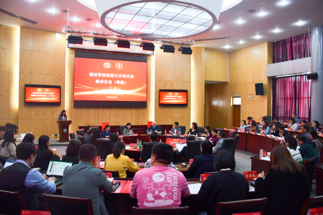 4月28日中午,我校四届三次教代会、工代会在圆形会议室隆重举行。73名正式代表和25名列席代表出席大会。副校长、工会主席王云飞主持会议。