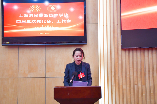 财务处处长助理陈洁作《2022年度学校财务情况报告》;工会副主席黄琪通报了四届二次双代会提案处理和四届三次双代会提案征集情况,并书面下发了《2022年度学校工会工作报告》、《2022年度学校工会经费审查工作报告》。与会代表对校领导班子成员和领导班子进行了民主评议,表决通过了四届三次双代会决议。