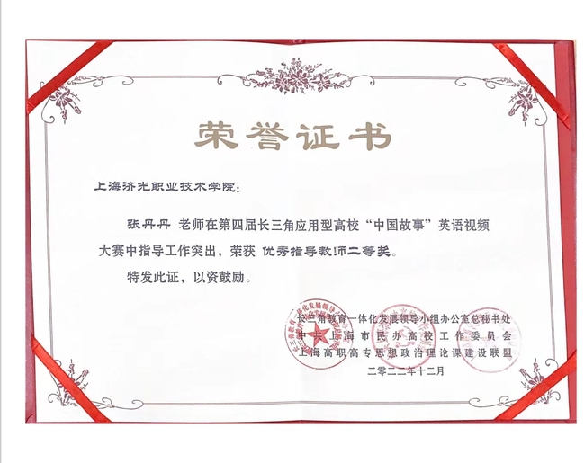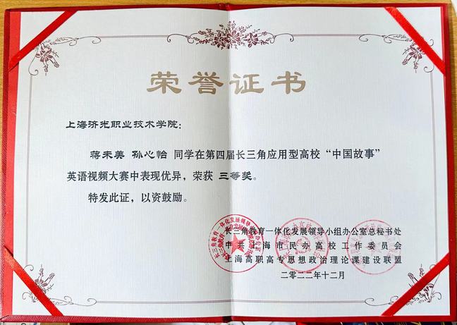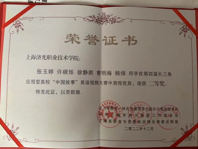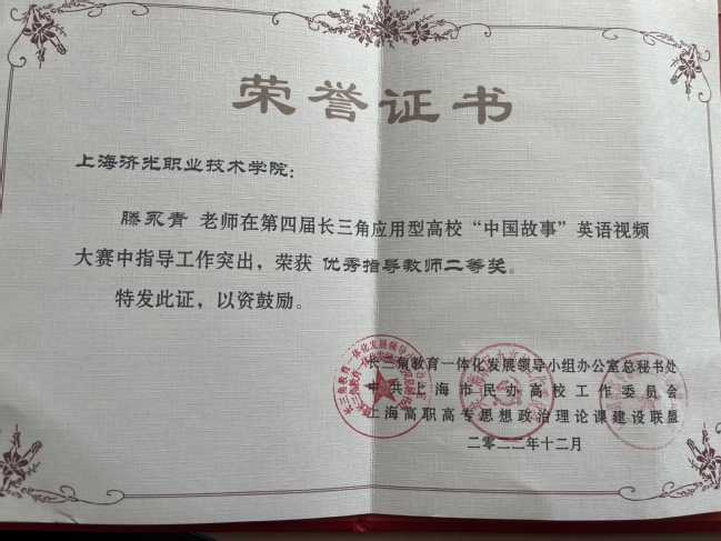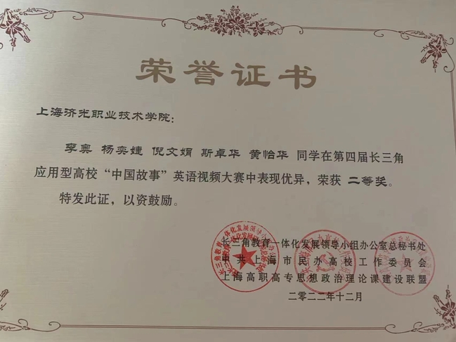 在校领导与各二级学院的大力支持下,我校参赛师生在赛期进行了精心准备。基础部公共英语教研室的老师们齐心协力,在业余时间对学生们进行了精心辅导。最终,在80多个参赛作品中,我校推送的《孔雀东南飞》(滕永青老师指导)获得了二等奖,《宝黛初见》(张丹丹老师指导)获得了二等奖,《桃花源记》(徐旻霞老师指导)获得了三等奖。
