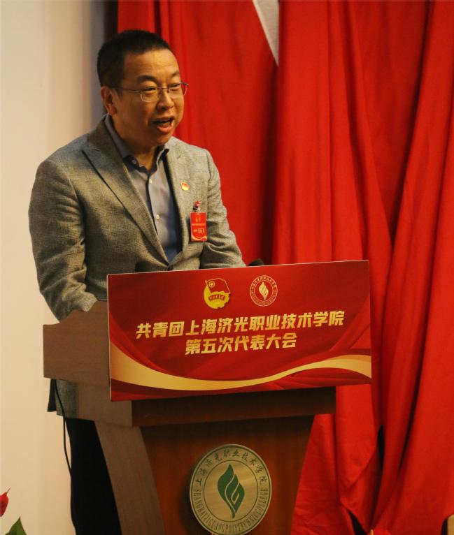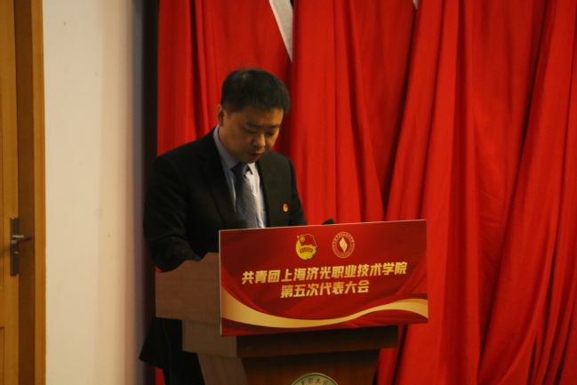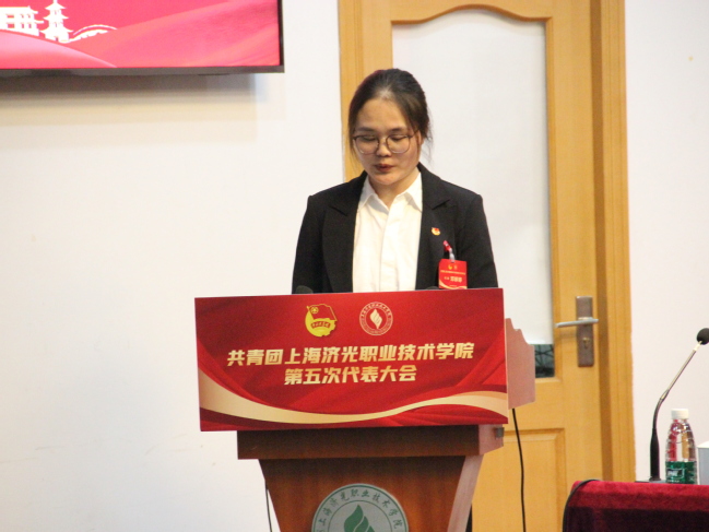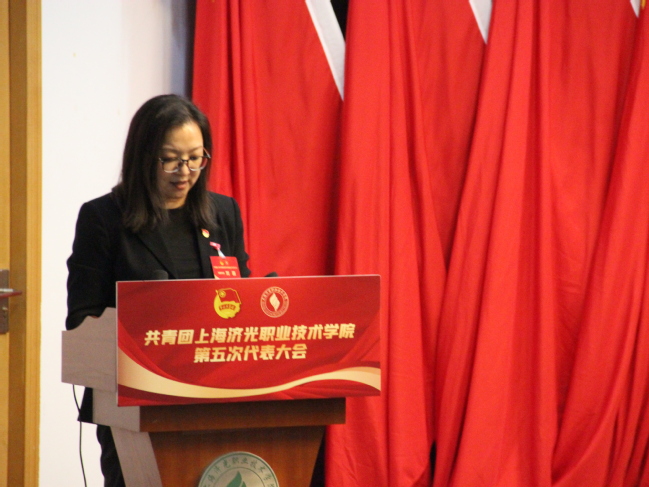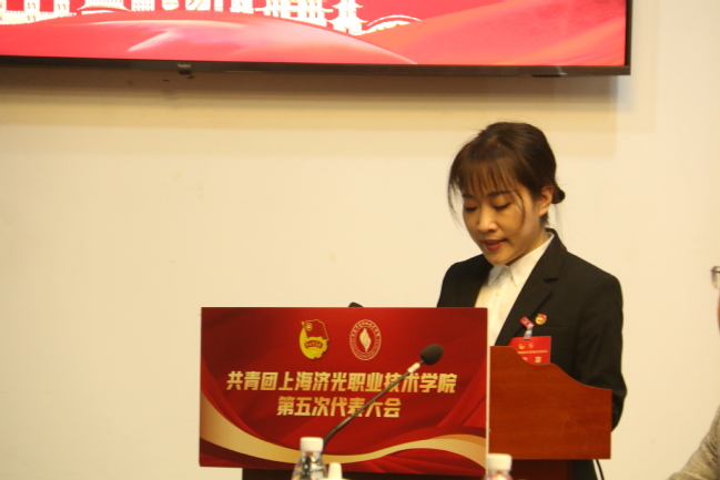 校团委书记邓婷婷代表共青团上海上海济光职业技术学院第四届委员会作了题为《心怀“工匠精神”奋力“追梦报国”团结带领广大团员青年为济光学院迈向职业教育高质量发展接续奋斗》的工作报告。报告系统回顾总结了我校共青团过去五年的主要工作和基本经验,对未来共青团工作提出了努力方向。报告中指出,学校共青团要在学校党委、团市委的坚强领导下,继续团结带领全校团员青年坚决以更加开拓创新的胆识魄力,更加锲而不舍的执着干劲,更加求真务实的工作作风,踔厉奋发,努力开创学校共青团事业发展新局面,为学校“十四五”发展建设汇聚青春力量,为上海加快建设具有世界影响力的社会主义现代化国际大都市贡献青春力量,为实现中华民族伟大复兴而积聚青春力量。