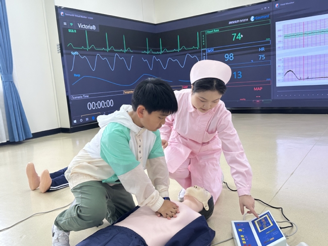 随后,同学们通过虚拟仿真实训技术学习了“心肺复苏”技能。在志愿者的指导下,借助模拟人依次进行了胸外按压、人工呼吸等实操练习,让同学们更直观地领会、掌握了急救要领,“沉浸式”体验了急救流程,现场的学习氛围积极又热烈。