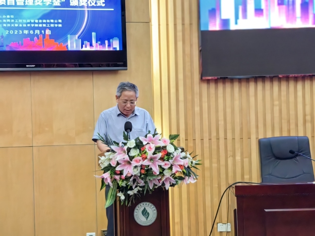 在颁奖仪式上,建筑工程学院院长曹吉鸣教授代表学院对上海同济工程项目管理咨询有限公司的大力支持表示了衷心的感谢,并勉励师生保持谦虚谨慎、不骄不躁的作风,在今后的学习、生活、工作中积聚正能量,再接再厉,发挥模范和表率作用,同时向全员师生提出了三点希望:第一,珍惜学生时光,虚心求知问学。“不因虚度年华而悔恨,也不因碌碌无为而羞愧”。第二,勇于拼搏奋斗,不负青春使命。明确未来职业发展规划,为全面建成中国特色社会主义现代化国家添砖加瓦。第三,坚定理想信念,厚植家国情怀。“立鸿鹄志,做奋斗者”,将个人之志与祖国命运相结合,扛起职中人的责任与担当,勇做走在时代前列的奋进者、奉献者。