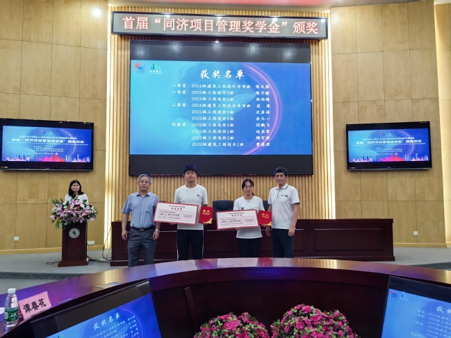 ▲王晓睿总经理和建筑工程学院曹吉鸣院长为同济项目管理单项奖学金获得者颁奖