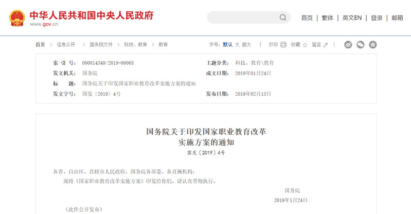 国务院印发《国家职业教育改革实施方案》。《方案》提出具体指标:到2022年,职业院校教学条件基本达标,一大批普通本科高等学校向应用型转变,建设50所高水平高等职业学校和150个骨干专业(群);建成覆盖大部分行业领域、具有国际先进水平的中国职业教育标准体系。