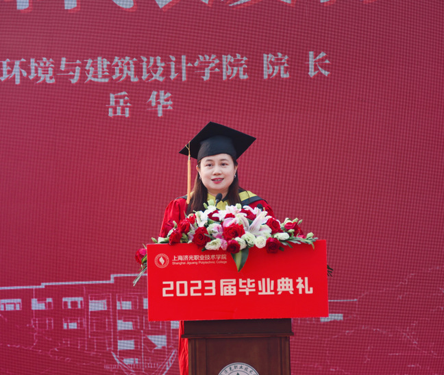 人居环境与建筑设计学院院长岳华教授作为教师代表在发言中寄语毕业生,要保持一颗虚怀若谷的求知之心,真诚待人,宽容处世,开阔视野、涵养胸怀,在时代的变迁中,坚持理想与信念,保持清醒的头脑,认清前行的方向和目标,抵挡诱惑、排除干扰。她鼓励毕业生要不断地去激发自己的内驱力,踏踏实实做事,在社会这座更大的学校中继续拼搏、建功立业、实现梦想。