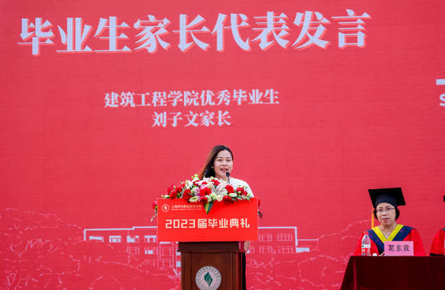 建筑工程学院优秀毕业生刘子文同学的母亲作为家长代表发言。她表示,济光“求实求新,人人成才”的校训滋养和熏陶了孩子,使刘子文坚定了自己的理想、信念与追求,并为之努力奋斗。她代表全体毕业生家长向三年来辛勤培育孩子健康成长的各位领导、老师以及教职员工表示崇高的敬意和衷心的感谢。