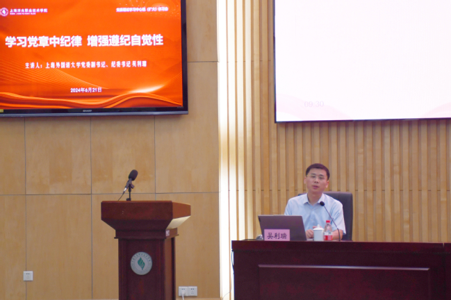 为进一步推进党纪学习教育走深走实,加强警示教育,让心存敬畏、手握戒尺真正成为党员、干部的日常自觉,教育引导全体党员强化纪律意识,严守纪律规矩,推动全面从严治党向纵深发展,按照学校党纪学习教育计划安排,6月21日上午,学校党委在圆形会议室举行校党委理论学习中心组(扩大)学习会,邀请了上海外国语大学党委副书记、纪委书记吴利瑞作题为《学习党章中纪律 增强遵纪自觉性》的党纪学习教育专题讲座。校党委理论学习中心组成员、全体中层干部、全体辅导员、思政教师等参加。会议由校党委副书记、纪委书记刘丽主持。