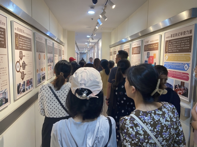 宝山区反腐倡廉教育基地共分“一路前行、新的征程、滨江清风、追案溯源、警钟雷鸣、筑牢防线、初心召唤”等七个篇章,跟随讲解员老师的讲解,党员教师们学习了我党在各个历史时期推进党风廉政建设和反腐败斗争的坚定决心和实际行动。自党中央八项规定通过以来,全党上下正风肃纪,十八大以来,党中央掀起了新中国成立以来规模最大、涉及层级最高、形势最复杂、成效最显著的反腐败斗争,彰显我党反腐败的决心和勇气。讲解过程中,讲解员老师以案说案、以案说法,为党员教师们深入剖析每一位受到贪腐查处人员背后违纪违法的原因和过程,每一个名字都昭示着党和国家反腐败斗争、全面从严治党的决心, “凡是行使了公权力,那便在党纪监察范围内”。