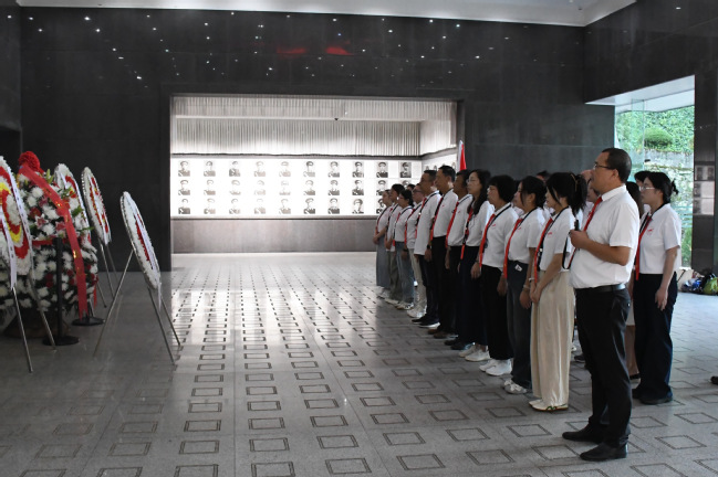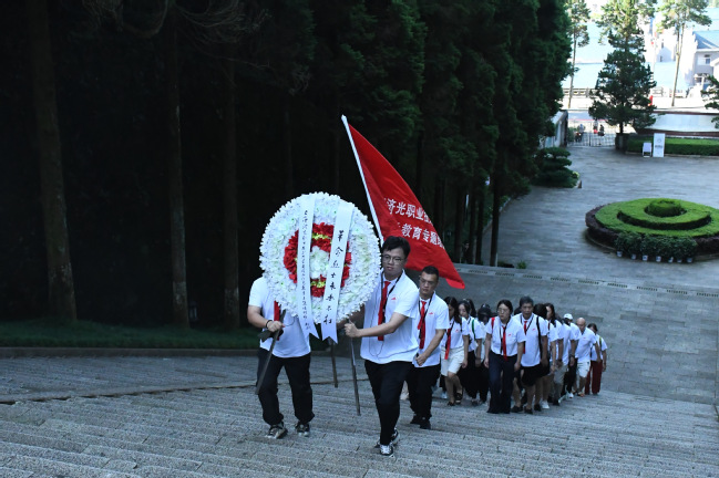 井冈山是革命的山、战斗的山,也是英雄的山、光荣的山。全体学员前往井冈山革命烈士陵园,重温历史、缅怀先烈,向革命先烈敬献花圈。在吊唁大厅和井冈山碑林,大家驻足伫立、肃穆追思,向革命先烈表示最崇高的敬意。面向党旗,党委书记姜富明带领全体党员教师重温入党誓词,进一步坚定理想信念,牢记初心使命。
