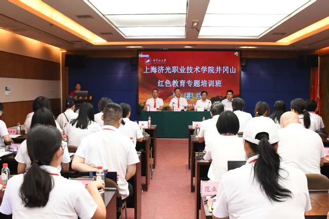 8月25日,专题培训班正式开班,党委书记姜富明作动员讲话。姜富明书记提出,希望全体学员能够深刻领悟、践行习近平总书记在考察井冈山时的重要讲话精神以及二十届三中全会有关教育的重要指示,将井冈山红色精神在各自的岗位上践行,进一步齐心协力将学校办成具有中国特色的高水平职业院校。 开班仪式上,井冈山大学党委副书记肖宜安致欢迎辞,并向培训班授旗,副校长孙遥代表济光学院接旗。开班仪式由同济大学挂职干部张赫主持。