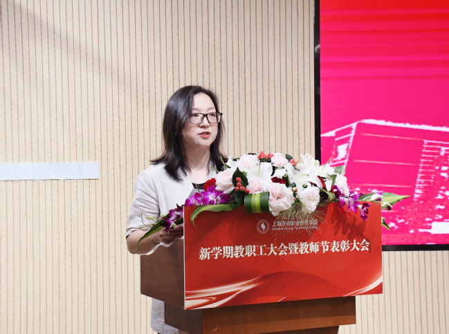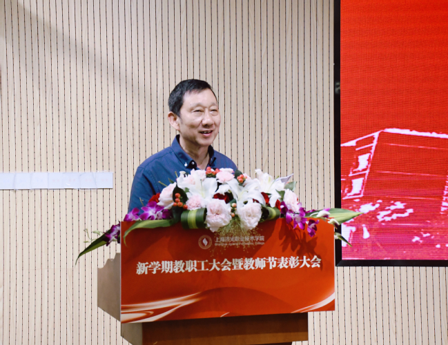 姜富明书记首先向全体教师致以节日祝福和崇高敬意,他向全体教职员工传达学习党的二十届三中全会精神和2024年秋季上海高校党政负责干部会议会议精神。他指出,党的二十届三中全会鲜明提出“统筹推进教育科技人才体制机制一体改革”,这是继党的二十大对教育、科技、人才部署后又一项重大战略部署,充分体现了党中央对教育科技人才的高度重视和殷切期盼。他要求全体教职工要切实把思想和行动统一到中央、市委、市教委决策部署上来,进一步立足自身实际,大胆探索实践,深化“人工智能+”教育改革,完善科技创新机制、人才发展和人事管理政策,深入推进“大思政课”综合改革,加强师德师风建设,优化专业布局,努力形成更多教育教学改革成果。他强调,全体教职工要处理好改革调整发展与学校稳健发展的关系,遵循民办高校教育的规律,保持定力、与时俱进、深化改革,全面推进学校各项事业发展;要处理好特色品牌专业和相关专业调整优化与服务能力贡献程度的关系,紧跟区域经济发展战略,以就业和产业需求为导向,以经济布局为中心跟进办学培养人才;要处理好干部队伍、师资队伍等建设与学校未来发展相匹配的关系,改革要有师资队伍、干部队伍管理的理念支撑,要把人才作为学校发展的第一资源,通过改革人才制度,统筹协调推进人才队伍建设,以更好地满足学校新发展阶段的新要求。