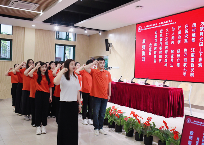 新进教职工在会上进行了优秀教师领誓、新教师宣誓仪式。在优秀教师代表岳华教授的带领下,新教师们立下铮铮誓言,铿锵有力、整齐坚定,深深表达了新一代济光人牢记教育使命的坚定意志和决心。