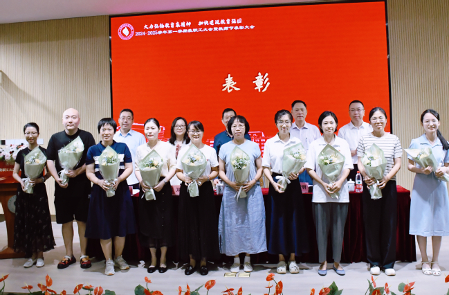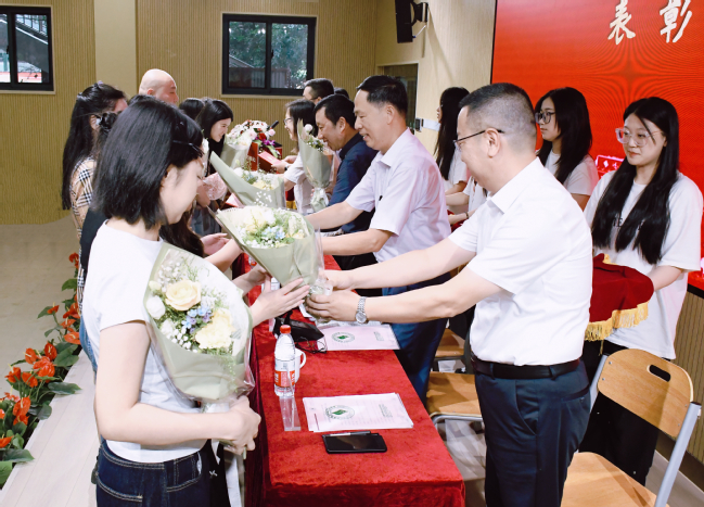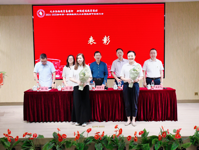 党委副书记刘丽宣读《关于表彰2023-2024学年优秀教师、优秀辅导员、先进教育工作者的决定》。校领导对获得校内“优秀教师”“优秀辅导员”“先进教育工作者”的教职工颁发了荣誉证书,为2023-2024学年获得市级以上荣誉的教职工代表献花。