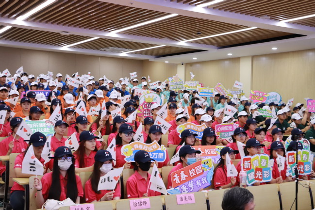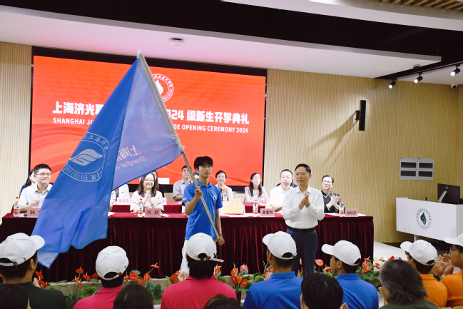 党委书记姜富明向新生代表授旗,希望新生秉承“求实求新 人人成才”校训,传承济光人的使命与荣光,用奋斗书写精彩的未来。