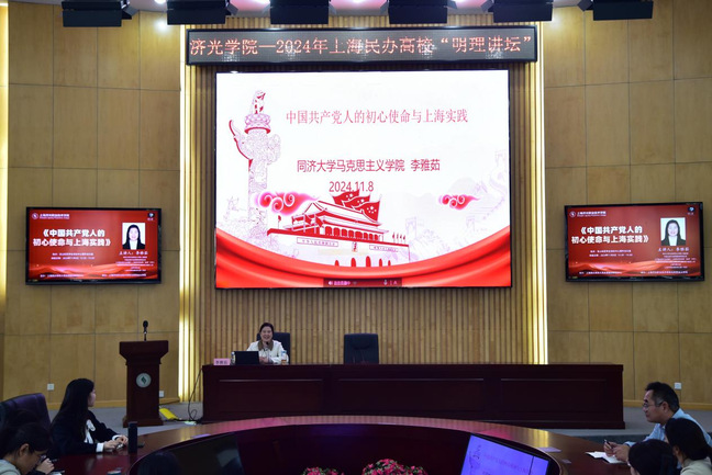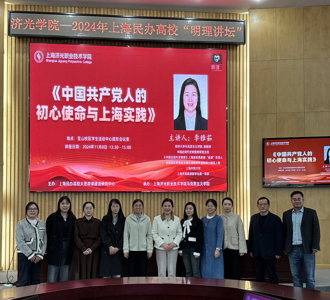 11月8日下午,由上海民办高校大思政课建设研究中心主办、上海济光职业技术学院马克思主义学院承办的明理讲坛在我校学生活动中心圆形会议室开讲。本次明理讲坛邀请了来自同济大学马克思主义学院的李雅茹副教授主讲。李雅茹副教授担任同济大学马克思主义学院中国近现代史纲要教研室主任,是中国近现代史纲要上海高校思政课“金课”负责人,曾获得全国高校思想政治理论课教师年度影响力提名人物、上海市育才奖、上海市思政课教学比赛一等奖等。李雅茹副教授以“中国共产党人的初心使命与上海实践”为主题开讲,全体马院教师和我校学生代表参加此次学习,本次“明理讲坛”讲座也是我校马院坚持常态化集体备课的活动形式之一。