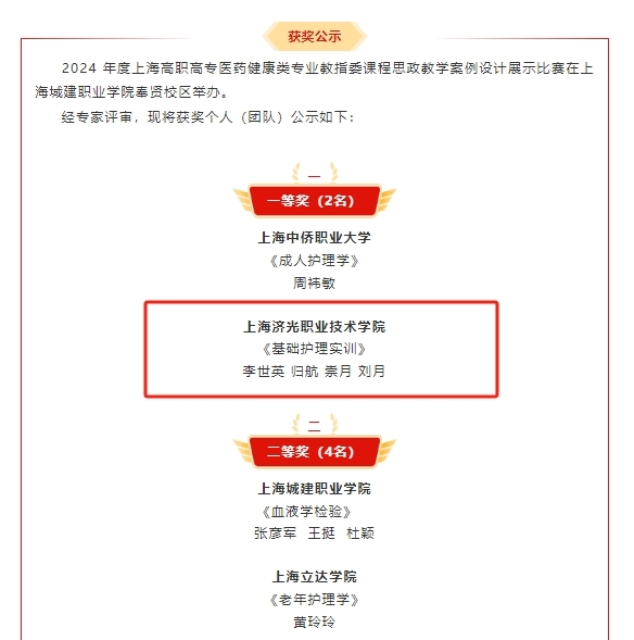 近日,由上海市高职高专医药健康类专业教学指导委员会主办的2024年上海市高职高专医药健康类专业课程思政教学案例设计展示活动在上海城建职业学院圆满落幕。我校护理学院李世英、归航、崇月、刘月四名教师的《基础护理实训》荣获了一等奖,展示了团队成员精湛的专业教学能力和优秀的课程思政建设成果。