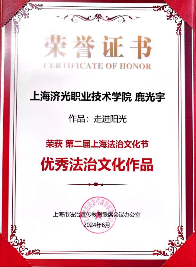 近日,第二届上海法治文化节作品征集比赛中,我校人居环境与建筑设计学院2023级建筑设计2班学生鹿光宇的法治摄影作品《走进阳光》获评优秀法治文化作品。