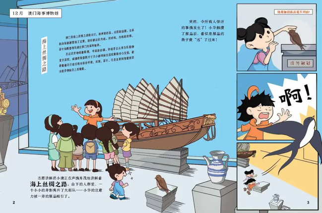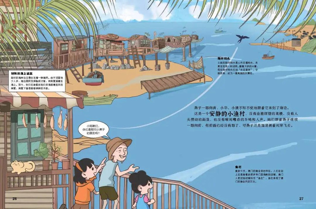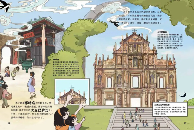 绘本中的故事以澳门海事博物馆里一只木雕的燕子突然变成真燕子飞起来为起点,正在参观的小华和小澳两个小朋友也因此相识合相识并欢快地追随着小燕子,开始了一段奇妙的旅程。他们跟随燕子飞过澳门的郑家大屋、亚婆井、大三巴牌坊、玫瑰圣母堂等地标建筑,一边探险一边学习澳门的历史文化。故事的结局充满惊喜,引人深思,使孩子们在阅读中获得知识同时,还能感受到澳门独特的魅力。创作团队还特别为澳门绘本设计了这样一个令人感动的瞬间:当燕子飞到一座小渔村时,小华和小澳想起澳门的起源。她们停下了脚步,静静地享受着渔村宁静的时光,就像在快节奏的现代文化中,忽然静下来慢下来,细细品味着时间的流淌。
