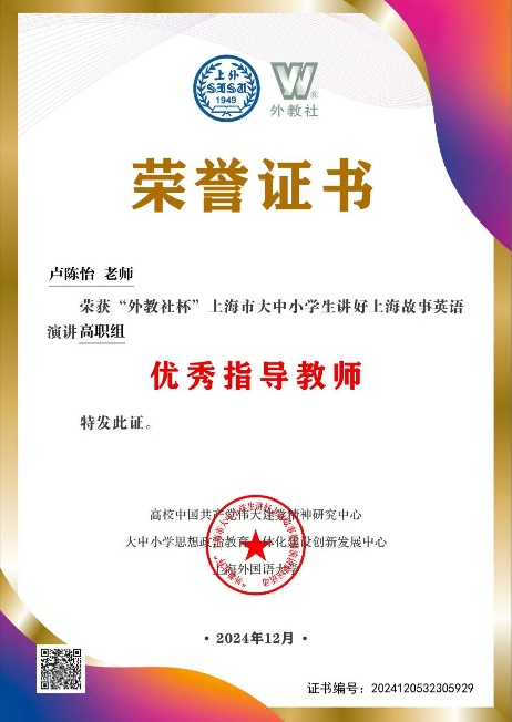 用英语讲述中国故事,展现时代青年风采。近日,“外教社杯”上海市大中小学生讲好上海故事英语演讲比赛圆满落幕。我校护理学院王歆绮同学和经济管理学院戴燕华同学荣获高职组三等奖,基础部卢陈怡老师荣获“优秀指导教师”称号。