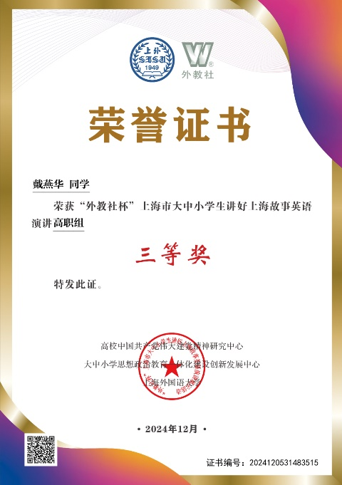 我校基础部高度重视此次大赛,为本次比赛提供了有力支持,我校参赛学生展现了对上海故事的深刻理解与精彩表达:王歆绮同学以红色文化为切入点,讲述了上海文化的魅力以及医学生的使命与担当;戴燕华同学通过“citywalk”这一新兴旅游方式,展现社区变迁与上海现代化发展的交融之美。两位同学凭借出色的英语表达能力,赢得了高职组三等奖的荣誉。