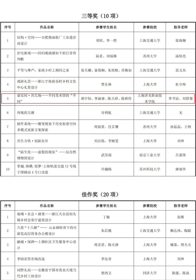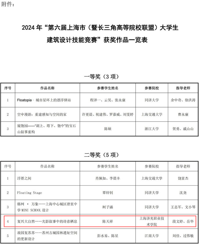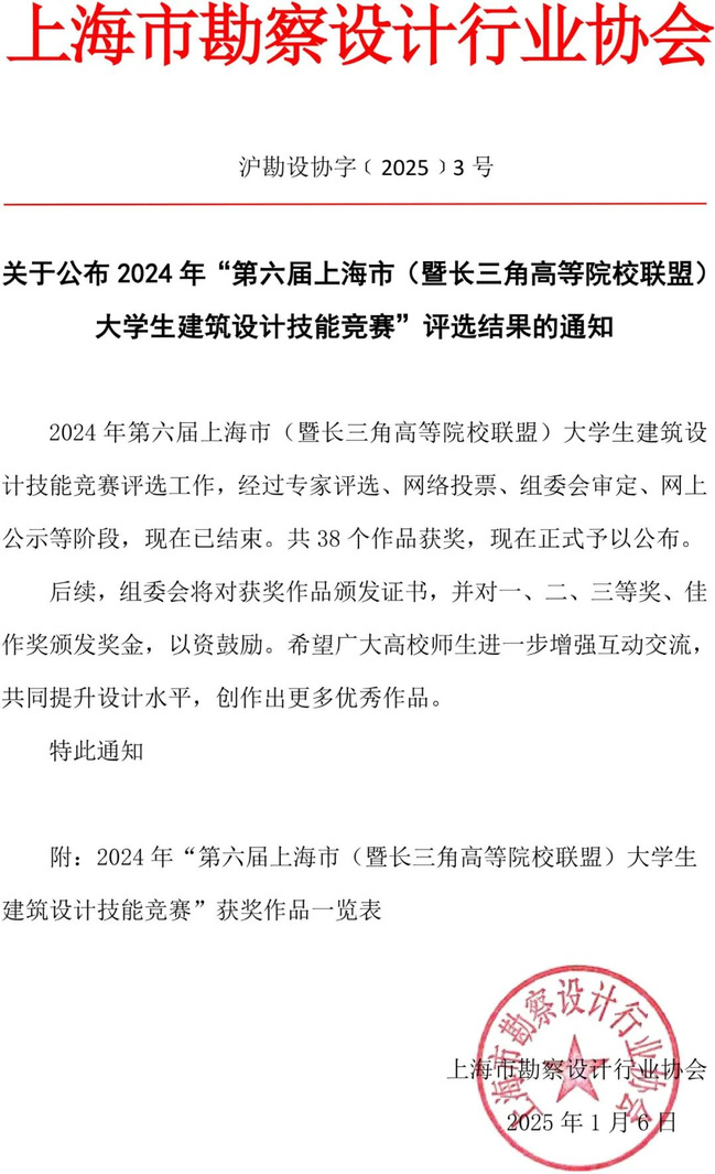 1月6日,第六届上海市暨长三角高等院校联盟大学生建筑设计技能竞赛公布竞赛评选结果。本次竞赛参与院校范围已扩充至长三角地区30多所具有设计类专业的高校,竞争激烈。最终,经一系列角逐,通过专家评选、网络投票、组委会审定以及网上公示等环节,我校人居环境与建筑设计学院最终有3项作品入围终评。经组委会严格审定,我校学生荣获二等奖1项,三等奖1项的佳绩。