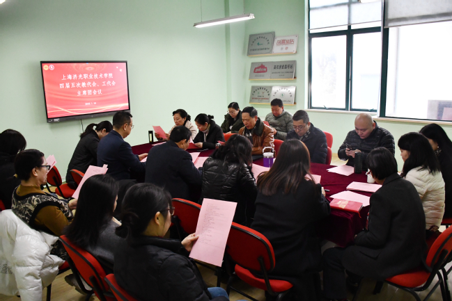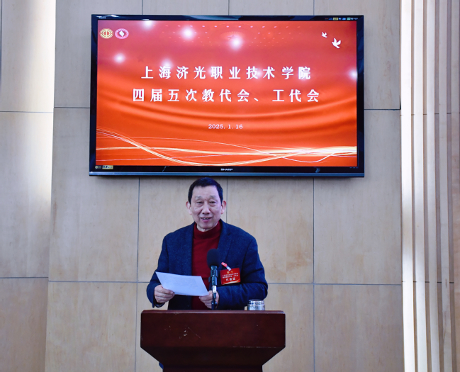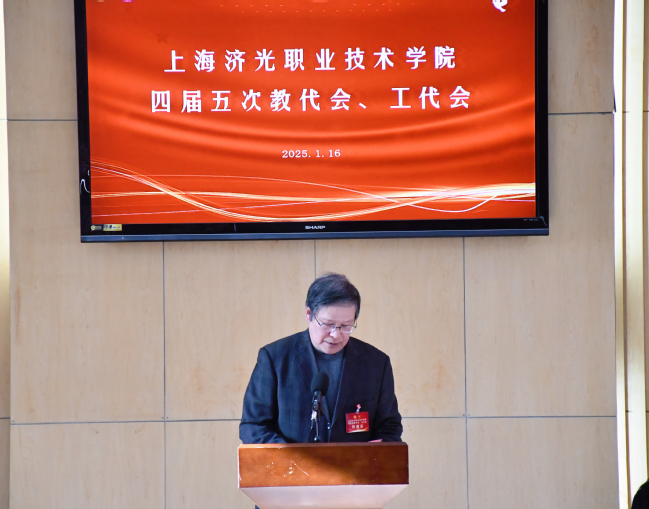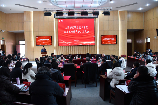 2025年1月16日,上海济光职业技术学院四届五次教代会、工代会在圆形会议室隆重举行。周家伦董事长出席大会并发表重要讲话,特邀代表、正式代表、列席代表共102人参加,大会由副校长、工会主席王云飞主持。