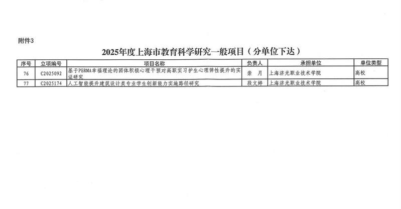 近日,上海市教育委员会公布了2025年度上海市教育科学研究项目立项名单。学校高度重视上海市教育科研项目的申报工作,积极组织教师申报,经过教师个人申报、资格审核、校内遴选、专家指导等环节,我校护理学院崇月和人居环境与建筑设计学院段文婷老师在上海市教育科学研究一般项目中成功立项。学校已连续三年获批上海市教育科研项目,彰显学校在教育科学研究方面取得的进步,对推进学校教育科学研究发展具有积极意义。