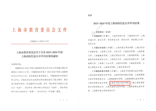 近日,上海市教育委员会发布《上海市教育委员会关于公布2023-2024年度上海高校信息公开评议结果的通知》(沪教委办〔2025〕8号),我校最终得分率在90%以上,被评为“优秀单位”。