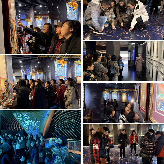 在观复博物馆的历代藏传唐卡精品展示空间,还展示着从四百多年前的传世唐卡作品以及现当代唐卡创作,调研团队认真观摩着唐卡的历史演变、矿物颜料的采集与研磨技艺、装饰色彩运用以及金箔纹样模压技艺所产生的特殊装饰效果。