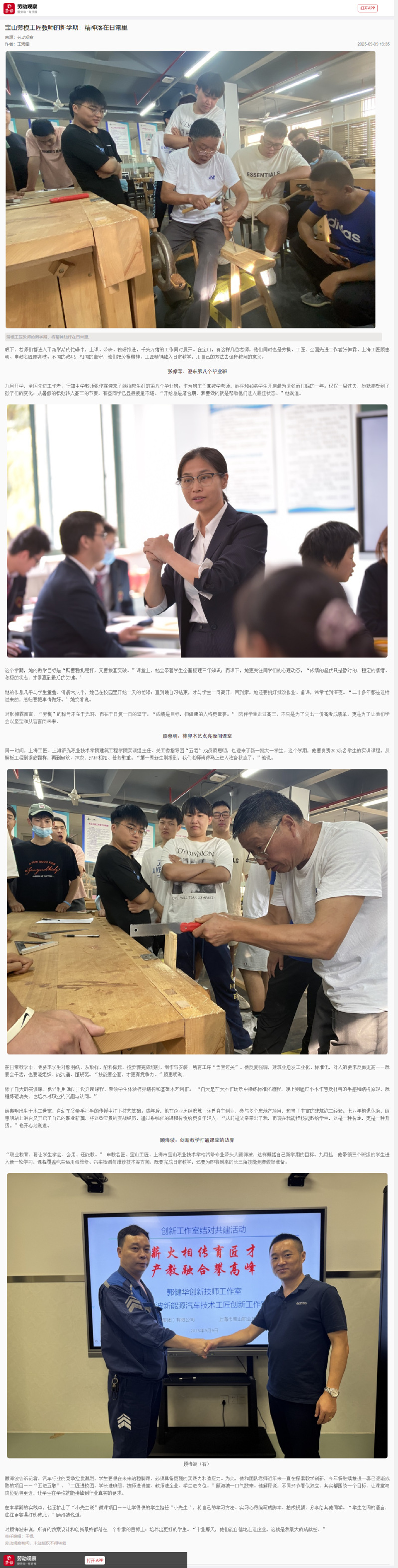 9月9日,“劳动观察”微信客户端以《宝山劳模工匠教师的新学期:精神落在日常里》为题,上海工匠、我校建筑工程学院实训组主任、关工委指导团“五老”成员顾惠明大师进行了报道。