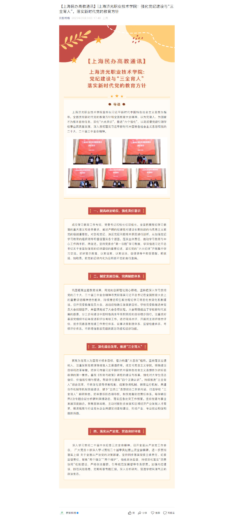 《上海民办高教通讯》9月30日刊登我校文章《上海济光职业技术学院:强化党纪建设与“三全育人”,落实新时代党的教育方针》。