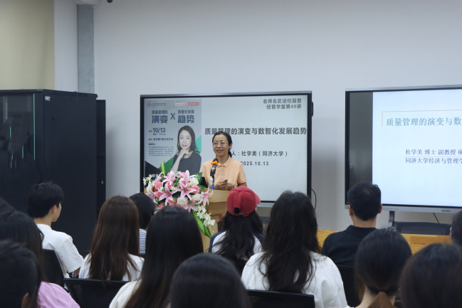 为强化师德师风建设,厚植经管学子的工匠精神,搭建专业学习与行业实践的紧密桥梁,在校教师工作部、经济管理学院(关工委)的大力支持下,10月13日下午,经济管理学院在实训楼7楼众创空间成功举办了“名师名匠进校园”宣传活动暨经管学堂第四十讲。此次活动邀请到党建共建单位同济大学经管学院管理科学与工程系支部副书记、上海市质量协会理事及质量技术评审专家杜学美作为主讲嘉宾,为同学们带来一场题为“质量管理的演变与数智化发展趋势”的精彩专题讲座。活动由经济管理学院副院长林俊老师主持,经济管理学院院长张迺英及60余名经管师生共同参与。
