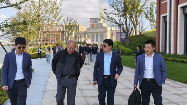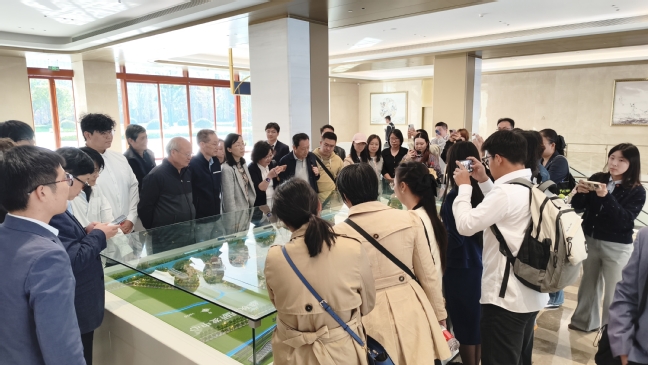 抵达华为青浦练秋湖研发中心后,师生一行在工作人员引导下参观园区。全景沙盘模型展现了2400亩“科技之城”的规划布局,环形轨道串联多个功能区,江南水韵与现代建筑交融,诠释了“科技与自然共生”的设计哲学。师生乘坐特色园区小火车穿行其间,聆听基地从农田村落到世界级研发中心的蜕变历程,两年内100余栋建筑拔地而起的“华为速度”展现了中国科技企业强大的工程执行力。