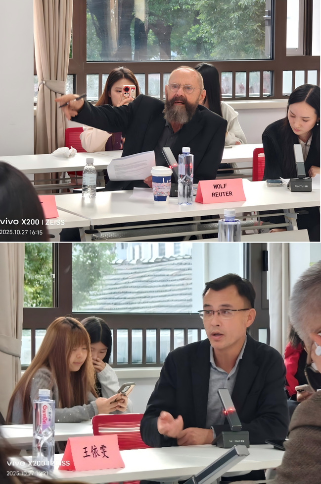 设计创意学院院长阴佳教授、副院长赵云与周豪杰,以及各专业主任和师生代表参加了此次活动。活动由建筑室内设计专业主任王云霞副教授主持,王依雯老师担任翻译。此外,同济大学建筑与城规学院俞泳副教授、莱茵鲁尔中德交流协会的会长、副会长及秘书长等也全程参与,为此次交流增添了多元的视角。