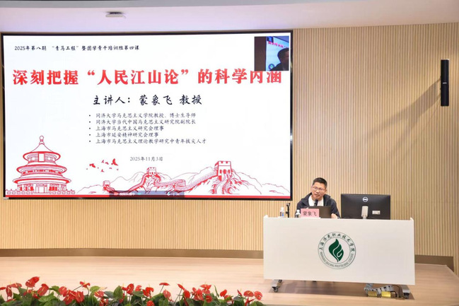 11月3日下午,我校2025年第八期“青马工程”暨团学骨干培训班第四课开讲。本次课程马克思主义学院特邀同济大学马克思主义学院教授、博士生导师,同济大学当代中国马克思主义研究院副院长,上海马克思主义研究会理事、上海延安精神研究会理事,上海市马克思主义理论教学研究中青年拔尖人才蒙象飞教授主讲。蒙教授以“深刻把握人民江山论的科学内涵”为主题,为全体学员带来了一场兼具理论深度与实践厚度的思想盛宴。马克思主义学院教师、本期培训班成员参与听课学习,本次课程在雨课堂平台同步直播。