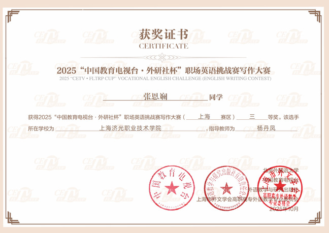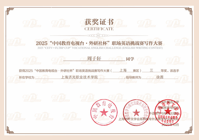 赛前,我校杨丹凤、徐茜两位指导老师对参赛的同学们进行一对一的辅导,有效提升学生们的思辨能力和写作能力。在两位老师的悉心指导下,2025级护理1班赵子澄同学荣获上海赛区二等奖、2024级电子商务1班张恩澜同学荣获上海赛区三等奖、2024级建设工程管理高本贯通班周子轩同学荣获上海赛区三等奖。此次比赛不仅考验参赛选手的英语水平和写作技巧,更全面展示了他们的综合素质。