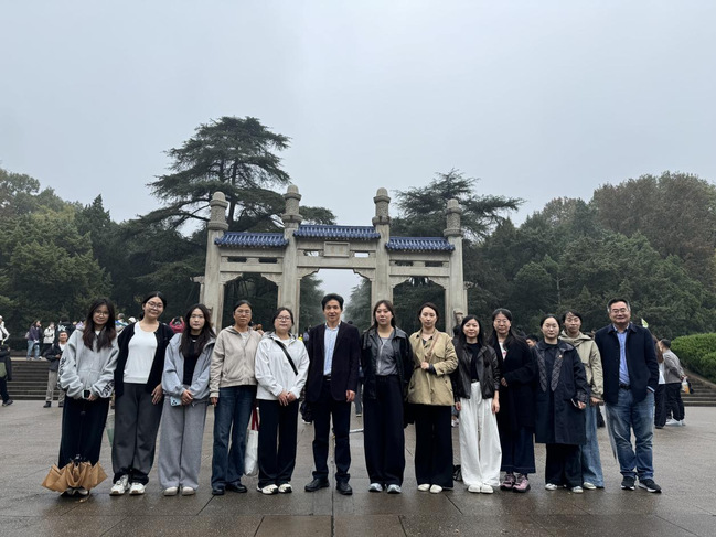 细雨蒙蒙之际,师生一行登上南京紫金山南麓的中山陵。这座始建于民国十五年的陵寝,是中国民主革命先行者孙中山先生的安息之地,130平方千米的园区内,陵园、廖仲恺何香凝墓等建筑错落分布,既是西方现代建筑思想与中国传统礼制的融合,更是革命理想与民族希望的象征。沿着392级台阶拾级而上,师生们在孙中山先生铜像前肃立,重温“天下为公”的革命理想与“三民主义”的救国主张。马院教师以“从革命先驱到新时代青年”为脉络,阐释“赓续民族魂”的时代接力——孙中山先生等革命先辈追求民族独立、人民幸福的理想,在马克思主义中国化的进程中被中国共产党继承与发展;今日新时代青年赓续民族魂,就是要将个人理想融入国家发展,在实现中华民族伟大复兴的征程中践行初心使命。