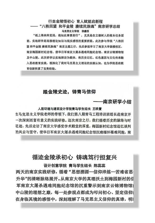 此次南京研学以“八秩回望和平金陵赓续民族魂”为主题,既是一堂生动的“行走的思政课堂”,更是一场精神的洗礼与信仰的淬炼。师生们在回望历史中读懂和平的珍贵,在触摸文化中感悟民族的精神,在理论与实践的融合中坚定了马克思主义信仰与家国情怀。研学结束后,研学队伍师生结合自己的岗位与研学经历,马院教师选取经典案例融入思政课教学或结合本职工作,撰写本次研学的研修案例集撰写及学习总结,青马学员代表们也用心用情完成此次研学的学习体会,形成卓有成效的研学成果,让红色薪火在我校师生心中燎原,坚定马克思主义信仰,增强对中国特色社会主义的信念,增强对实现中华民族伟大复兴的信心,汇聚起磅礴的复兴伟力。大家纷纷表示,将以此次研学为契机,把“赓续民族魂”的信念转化为行动,教师深耕思政课堂,让红色基因与民族精神融入教学;学生立足学习实践,以青年之力守护和平、传承精神。