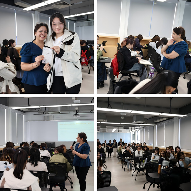 11月6日上午,同学们有幸走进了耀中幼教学院的课堂现场,亲身体验了全英文授课环境。Payal老师主讲,潘瑞峰老师现场提供翻译,Payal老师以“教育领导力”为主题,讲述了四种教师类型和四种人际沟通领导模式,协同合作型、非主导型、主导控制型、主导资讯型。并针对四种模式提供了如何改进的方法。课堂上老师鼓励学生们用英文表达自己的看法,这次课程进一步拓宽了同学们的国际视野,提升了她们的跨文化交流能力。