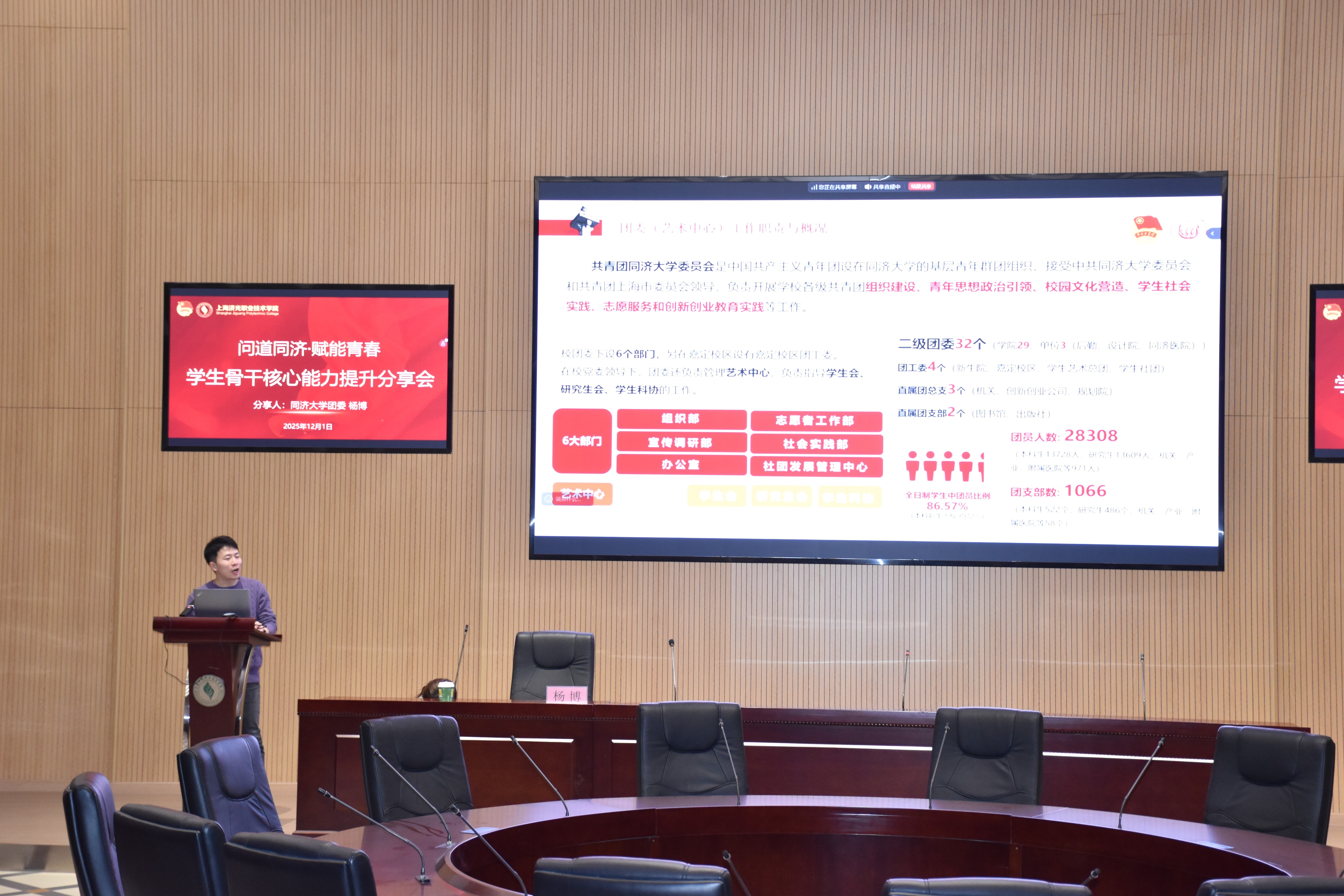 12月1日晚,我校在宝山校区圆形会议室举办“问道同济·赋能青春”学生骨干核心能力提升分享会,本次活动由学校学工部、校团委联合主办,特邀同济大学团委副书记(兼职)杨博博士来校交流,团学骨干及“一站式”学生社区自管委骨干参与活动,杨浦校区西教309分会场线上同步直播。