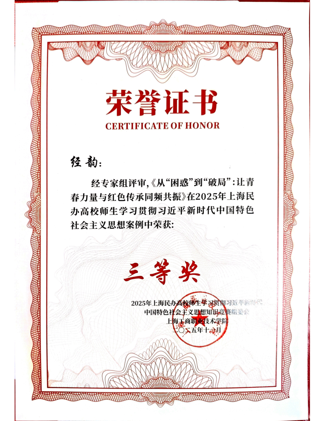 经韵的工作案例《从“困惑”到“破局”:让青春力量与红色传承同频共振》创新提出红色传承赋能思政教育策略,针对高职学生实践意义感薄弱、效能感不足、迁移性障碍等困扰,运用“挖掘+创造+传播”实践育人模式,构建可复制推广的思政育人新范式。