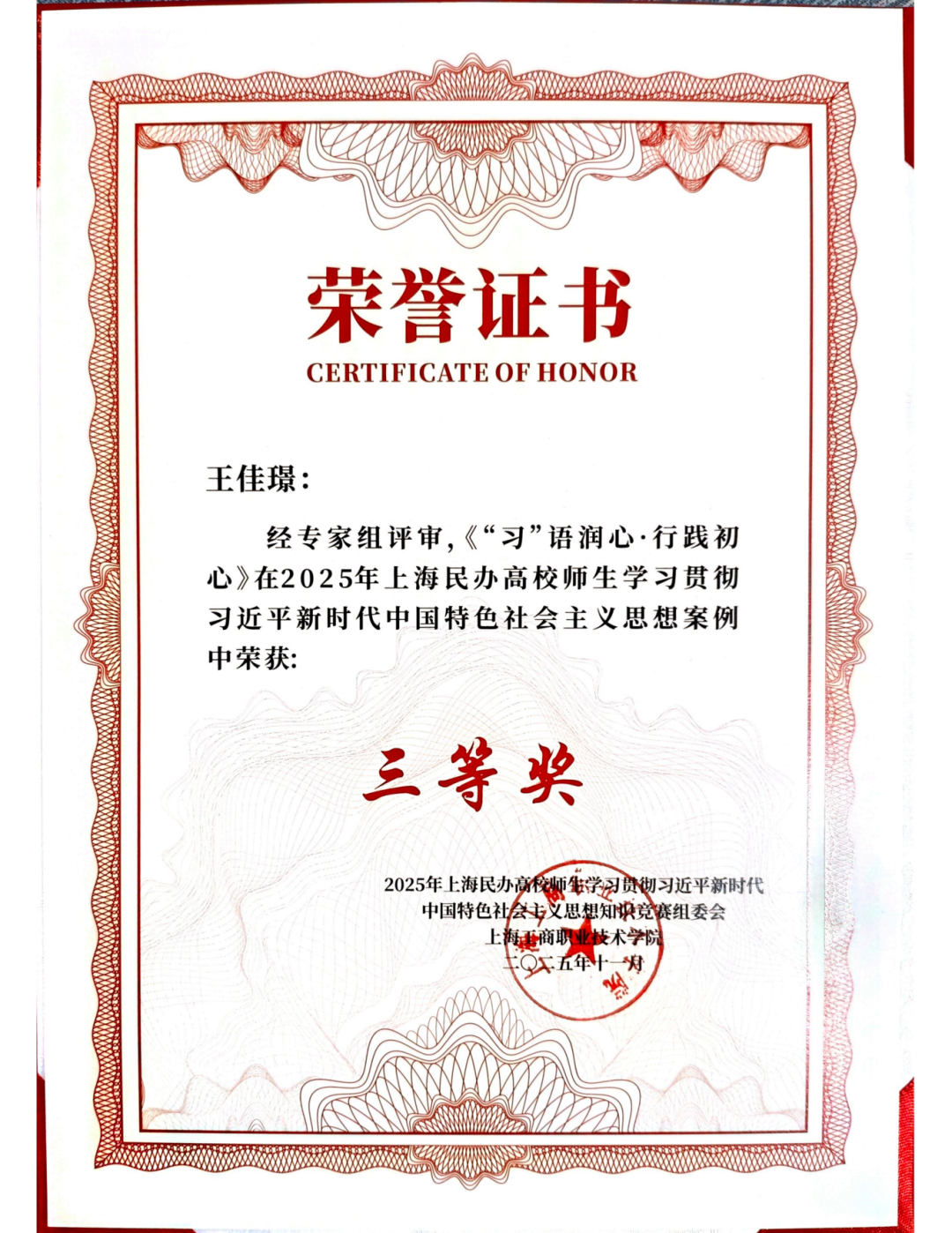 11月28日,2025年上海民办高校师生学习贯彻习近平新时代中国特色社会主义思想知识竞赛决赛暨表彰大会在上海工商职业技术学院嘉定校区召开,我校学前教育学院辅导员经韵、经济管理学院辅导员王佳璟的工作案例荣获三等奖。