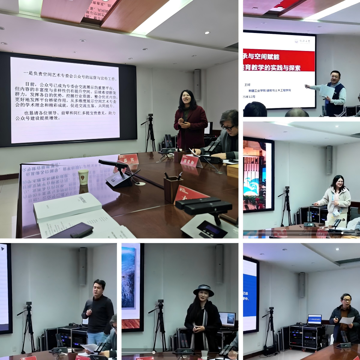 另外此次年会也邀请了空间专委会共建单位的王珂教授,王教授这次不仅作为同济大学建筑与建成环境创新基地常务副主任、同时也作为新疆工业学院建筑与土木工程学院院长的身份参加年会,这也使空间专委会的成员辐射到了祖国新疆。王珂教授结合同济大学的美育教学及新疆工业学院的建设,以《工艺传承与空间赋能》为题,分享创新实践及感悟;我校设计创意学院副教授王云霞,汇报了作为专委会副主任所负责的公众号建设情况,并分享了大师工作室的建设和教学与乡村振兴相结合的实践经验;西安美术学院教授杨志带来了《行走的瓷音2025 创作笔记》,并提议专委会来年举办陶瓷艺术作品大赛,搭建工艺创作交流平台;景德镇汉世陶瓷有限公司龚善斌认为,从郭爱和大师的“洛阳三彩”艺术实践和蒋国兴大师深入社区层面的公益活动中得到启发:手工陶瓷艺术,既能通过微观的创作过程实现对人的公益赋能,又能通过宏观的空间塑造实现对环境的公益提升;上海市工艺美术大师徐洪雁现场展示了陶瓷泼绘作品,分享了《陶瓷泼绘创作及表达》的心得,阐释了偶发性因素对作品肌理呈现的独特影响;苏州金螳螂建筑装饰股份有限公司上海设计院总院副院长蒋缪奕从室内设计转型视角出发,提出存量时代下艺术赋能室内增值的发展方向,并强调拥抱 AI 等新科技的重要性;《在洛阳》新媒体创始人王晓鸽校长,回顾了“当日”公益项目对当地乡村教育的积极贡献,呼吁持续以美育助力乡村儿童成长。此外,龚善斌、张永干、孙佩利、夏志平、李玮等嘉宾也分别结合自身研究与实践,就雕塑艺术、工艺生活化、空间艺术创新等话题展开深入交流,现场氛围热烈。