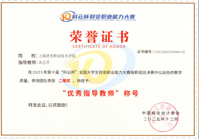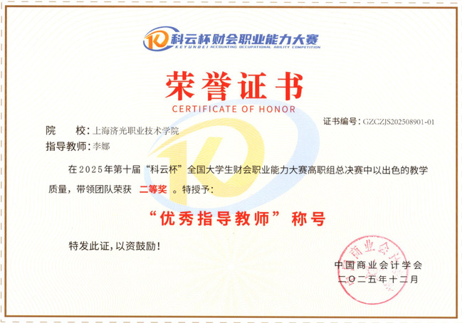 为不断提高学生财务数智化职业技能,以赛促教,以赛促学,在学院领导的支持下和辅导员的协助下,我校大数据与会计专业李娜和余志芳两位老师组织并辅导两个代表队参加比赛。经过1个多月努力拼博,在全国选拔赛中,吴亦瑄、陈丹、张佳慧、崔静怡组成的济光1队荣获三等奖;朱昱旭、王欣瑜、郭子霞、蔡佳俊组成的济光2队荣获一等奖,顺利挺进总决赛。在全国总决赛的巅峰对决中,面对全国内众多强校,朱昱旭、王欣瑜、郭子霞、蔡佳俊组成的济光2队沉着应对,最终荣获全国二等奖的好成绩,李娜和余志芳老师被授予“优秀指导教师”称号,我们学校也被授予“优秀组织奖”称号。