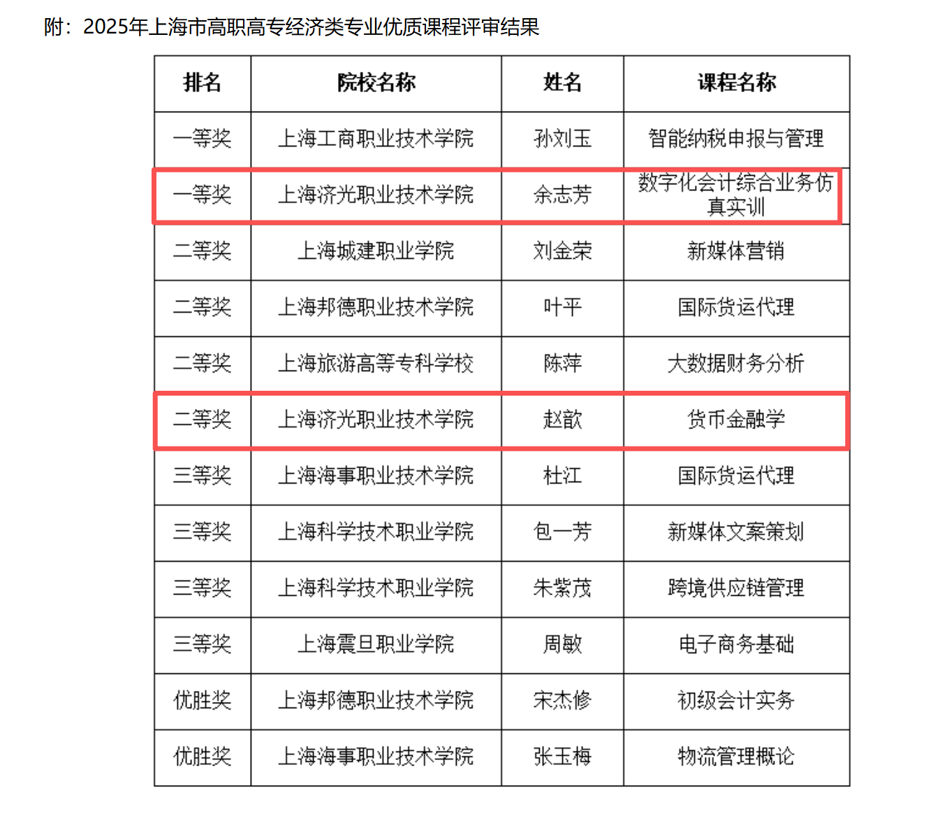 2026年1月13日,我校经济管理学院余志芳老师的《数字化会计综合业务仿真实训》课程、赵歆老师的《货币金融学》课程在上海市高职高专经济类专业优质课程评审中分别荣获一等奖、二等奖!
