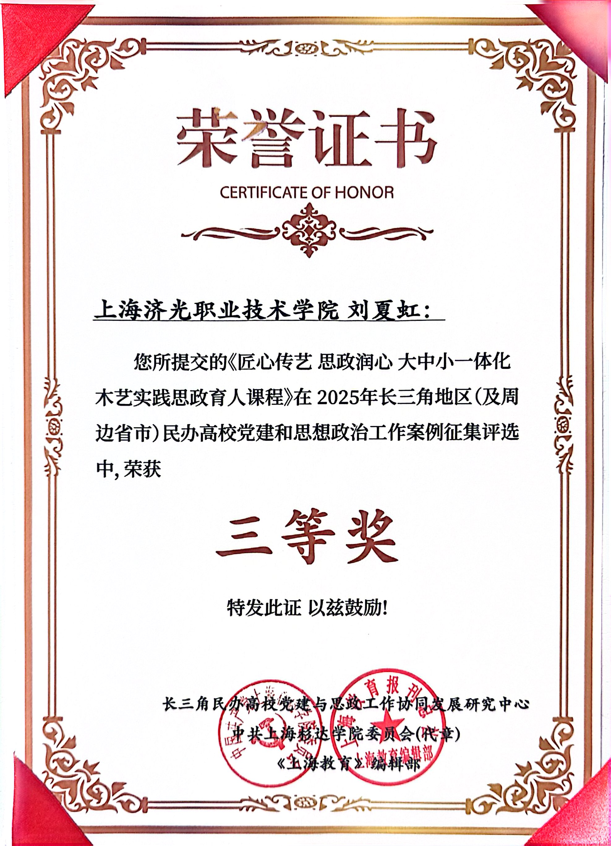 近日,2025 年长三角地区(及周边省市)民办高校党建和思想政治工作案例征集活动评选结果揭晓,我校党委宣传部报送的《匠心传艺 思政润心 大中小一体化木艺实践思政育人课程》案例荣获三等奖,该案例由城市空间数智学院直属党支部书记刘夏虹撰写。
