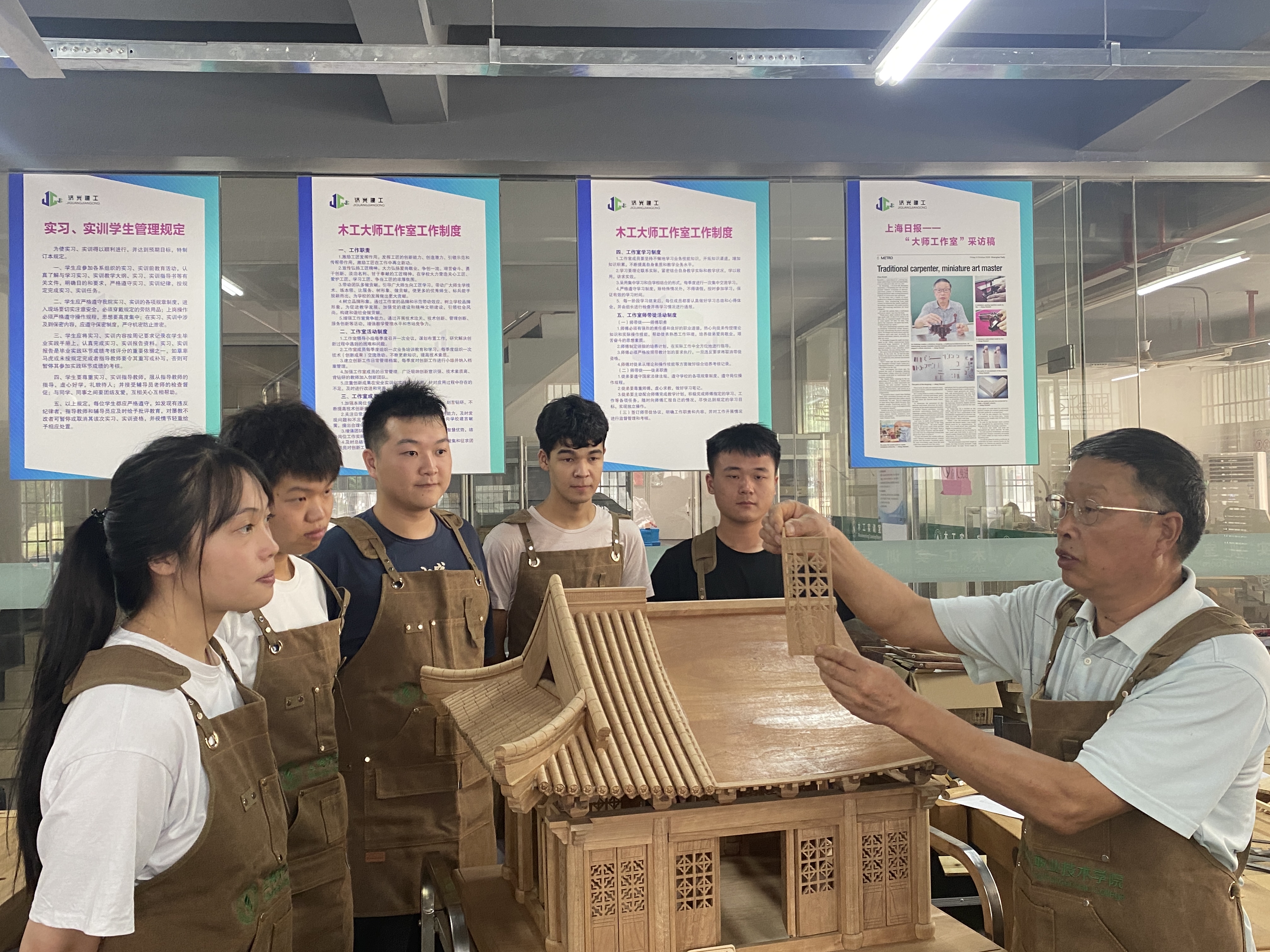 该案例中提到,顾惠明大师工作室聚焦大中小一体化木艺劳动教育,将工匠精神、劳动精神与思政教育深度融合,形成了特色鲜明、成效显著的实践育人模式。顾惠明大师为中共党员,2017年度“上海工匠”,上海市劳模工匠育人基地负责人,宝山区非遗木作工具制作技艺传人,现任我校城市空间数智学院教学实训主任、关工委特聘“五老”指导团成员。自 2018 年退休返聘以来,他始终坚守育人一线,放弃寒暑假与双休日,六年如一日深耕劳动教育与课程思政融合创新,他既是学生思想成长的引路人、专业学习的辅导员,也是青年教师传帮带的良师益友。他牵头打造大中小幼一体化木艺实践体验课程,累计开展活动150余场次,惠及青少年5万余人次;创新推出“一展、二讲、三演、四指导、五点评”五步教学法,精心研发200余项适配各年龄段的木艺体验项目,将思政元素、工匠精神融入实践全过程,以木艺为桥、以匠心为魂,助力青少年德智体美劳全面发展。